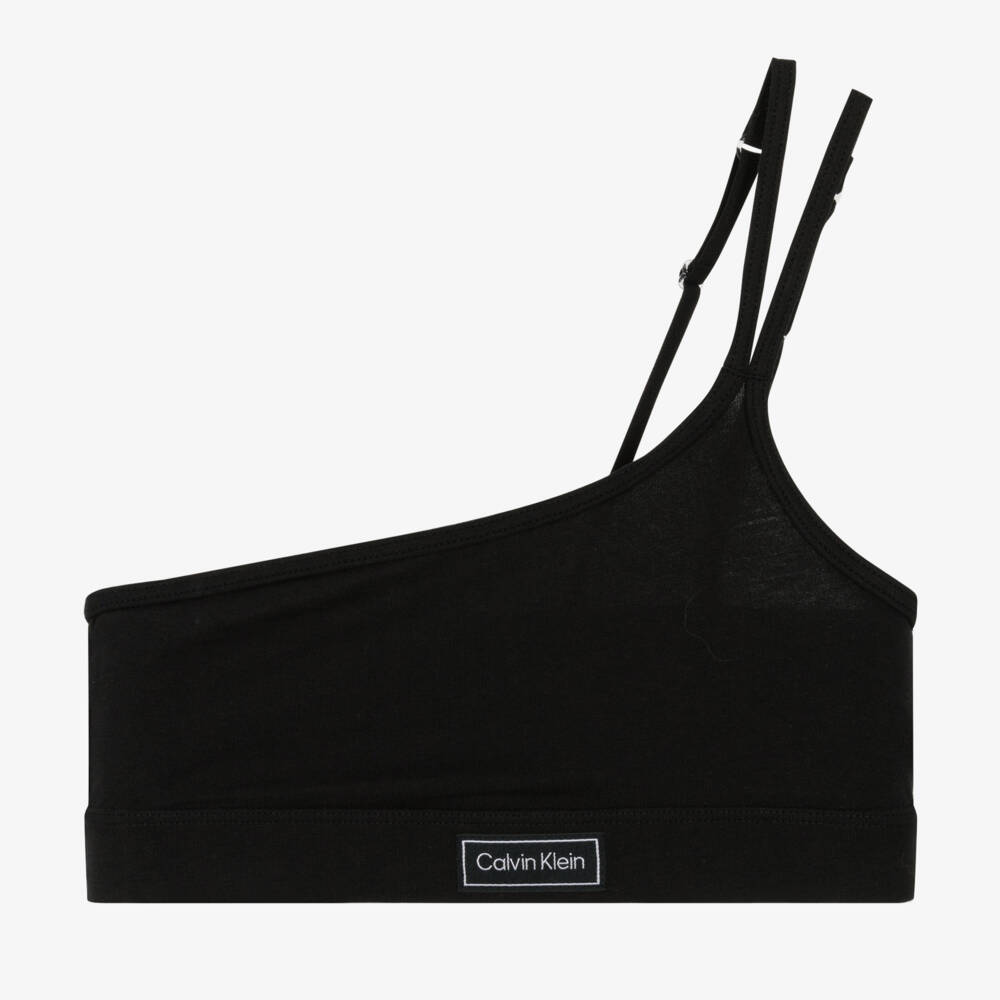 Black bralette for girls by Calvin Klein, made in soft and comfy cotton jersey. This one shoulder design has double straps on one side, both adjustable for an ideal fit. There is a gently elasticated underband, with a banded tab on the front for a signature look.