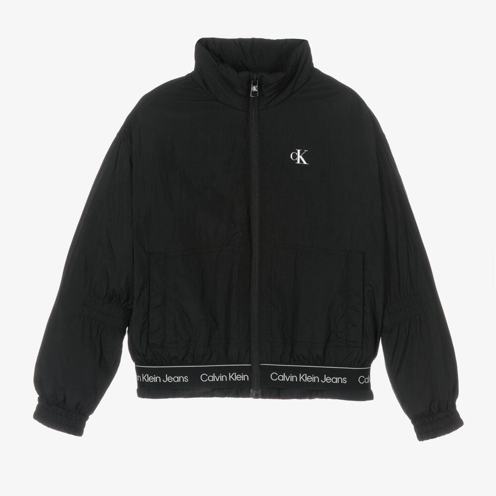 Black jacket for girls by American brand Calvin Klein Jeans. Made in lightweight, silky, recycled fibres, it is lightly padded with cosy elasticated cuffs and an elasticated logo tape around the hem in black and white. On the front is a white monogram logo and useful hand pockets that fasten with poppers. The jacket fastens with a front zip and has a black satin lining with a large white logo in the centre. The insulation is made with 90% REPREVE® recycled polyester.