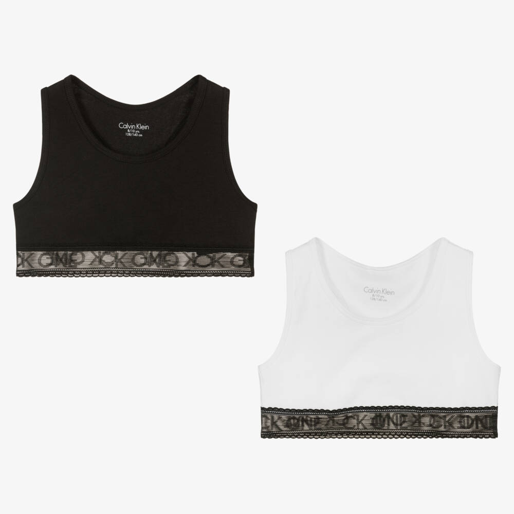 Pack of two bra tops for girls, one black and one white by Calvin Klein. Made in soft cotton jersey, both tops have a black, elasticated lace trim with tonal logo lettering.