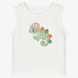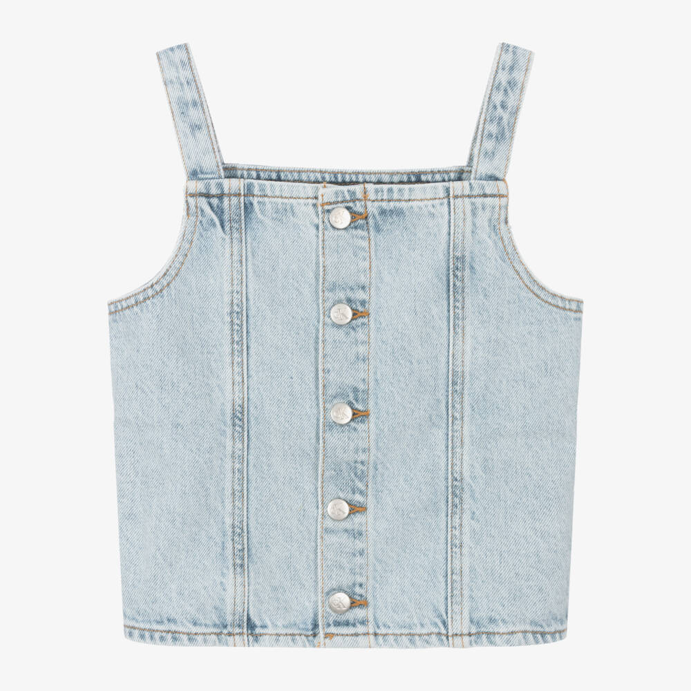 In a light blue wash, this sleeveless denim top for girls is by American brand Calvin Klein. Cool and casual, it fastens easily with branded popper fastenings down the front and has a CK monogram patch on the back for a designer touch.
