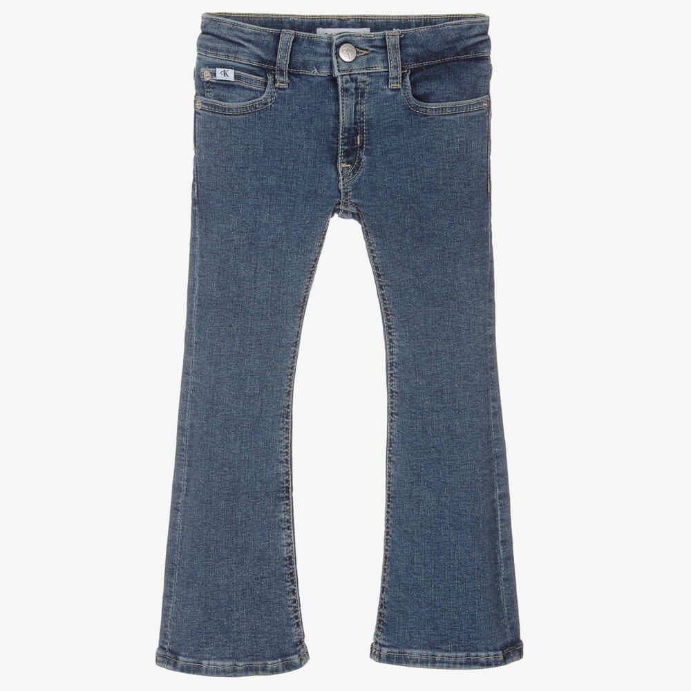 Flared denim jeans for girls by Calvin Klein, in a blue wash. Made in stretchy cotton denim, these vintage-inspired jeans have a mid-rise waist and five-pocket styling. There is a Calvin Klein monogram badge on the back of the waistband and embossed branding on the silver hardware. They fasten with a button and zip and have an adjustable waist to provide plenty of room for growth. This product is made with at least 20% certified recycled cotton and achieves its finished look using a lower impact process.