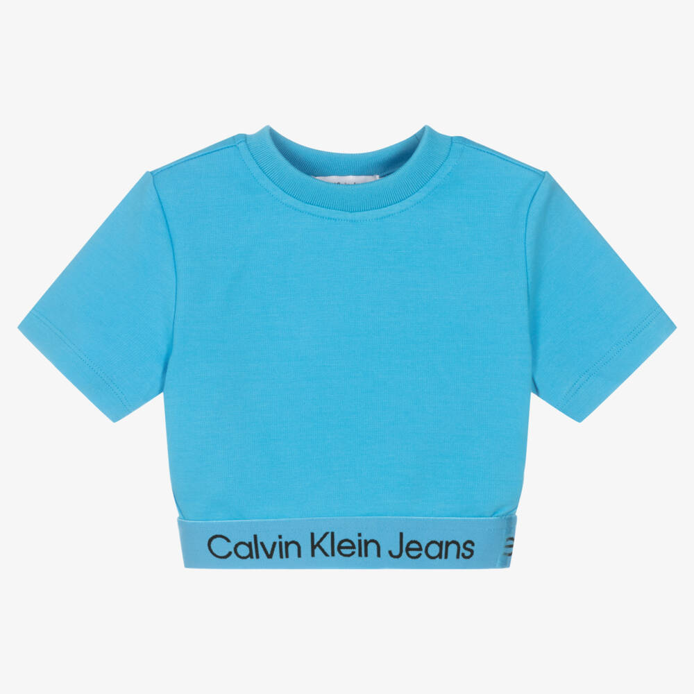 A blue T-shirt for girls by Calvin Klein Jeans, made in a soft and sustainable viscose jersey. Cool on casual days, this top has jacquard logo taping, giving definition and drama to the cropped waistline.