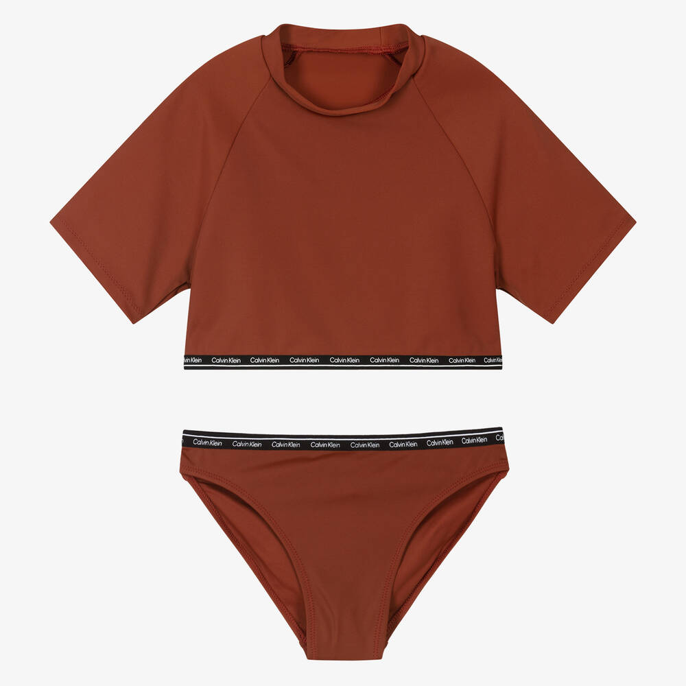 Stylish reddish-brown tankini for girls by Calvin Klein. Using recycled nylon, it is made in stretchy lycra and fully lined for comfort. The top has a cut out detail on the back for a sporty look, and both pieces are trimmed with signature black and white logo tape.