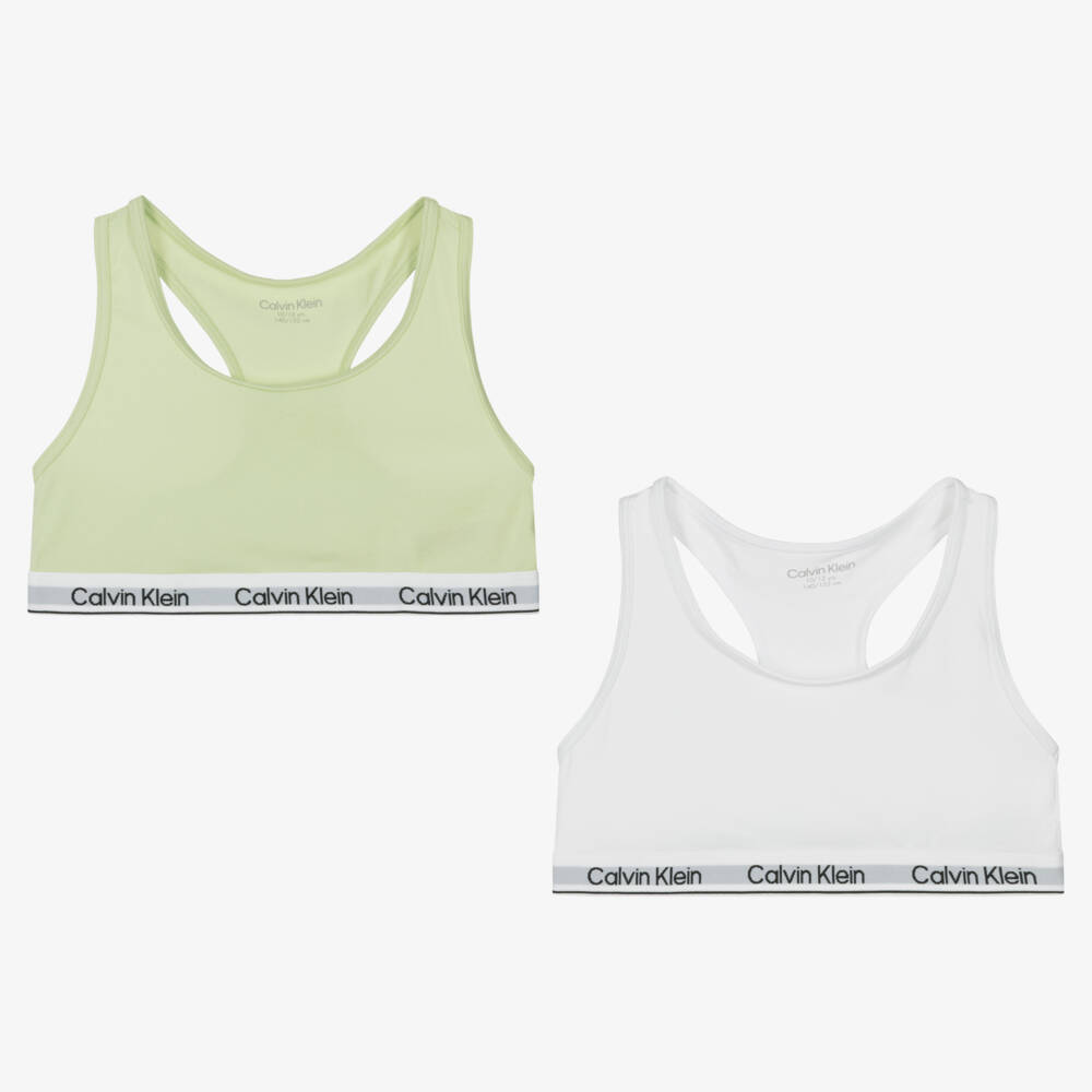 Pack of two bra tops for girls by Calvin Klein, in white and lime green. Made in soft cotton jersey for comfortable wear, both tops have a racer back style and an elasticated trim with black logo lettering.
