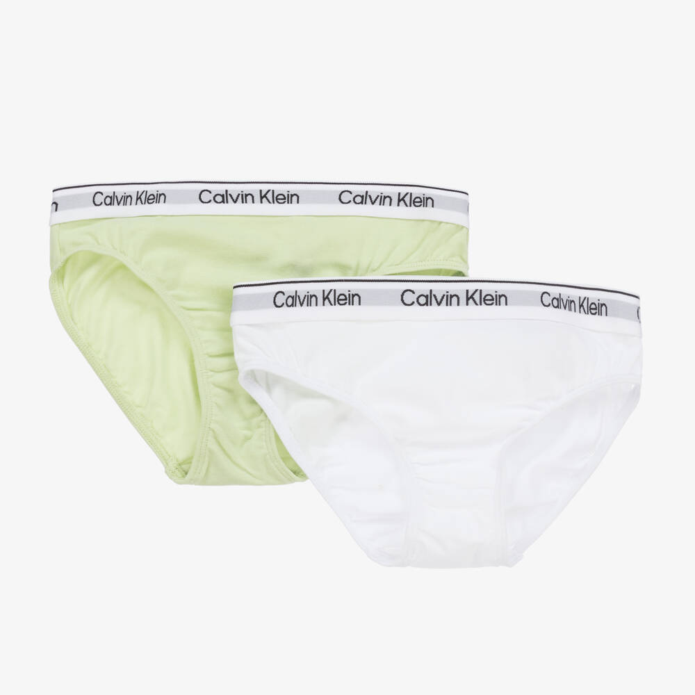 Two pairs of bikini-style knickers for girls by Calvin Klein, one in lime green and the other in white. Made in comfortable cotton jersey, they each have an elasticated logo-branded waistband.