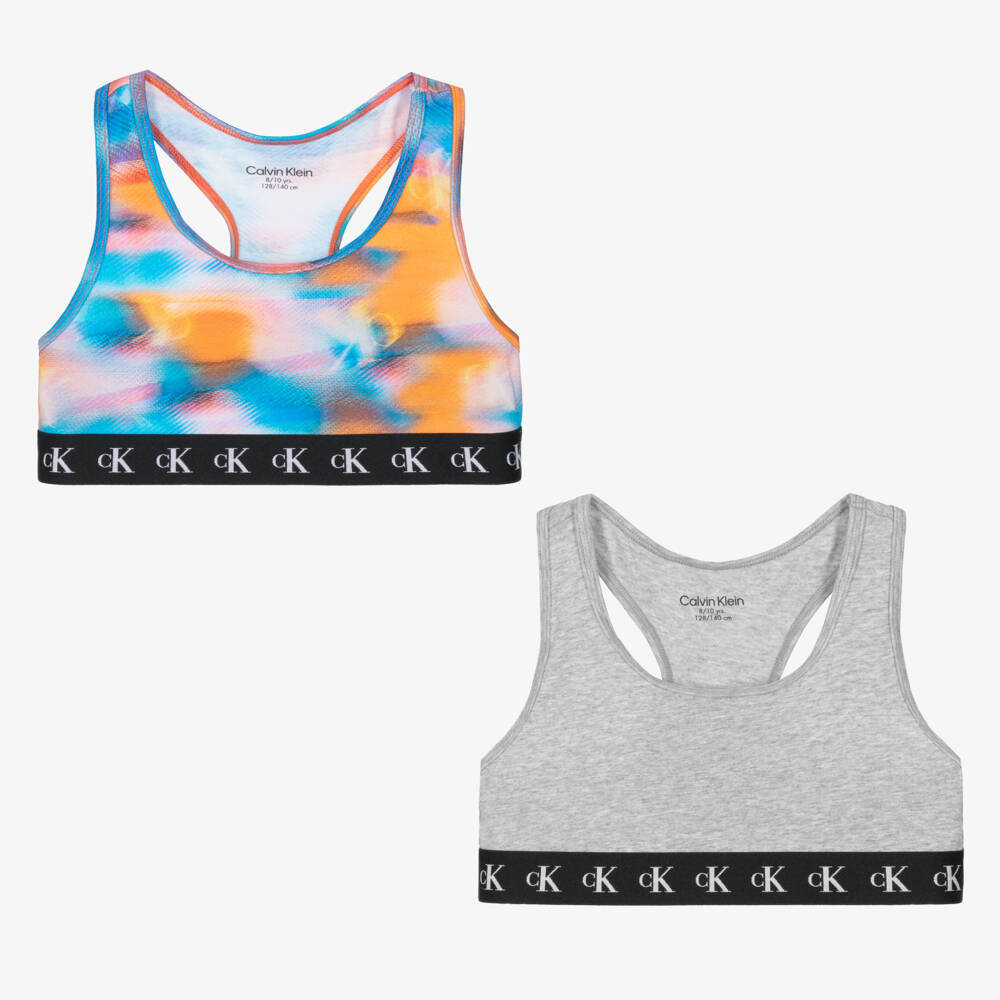 A pack of two bra tops for girls from Calvin Klein, made in soft and stretchy cotton jersey. Both in a classic shape with racer backs, one top is grey marl, and one is patterned with an abstract blue, orange and pink woven-effect print, incorporating the designer's monogram logo in white. Known for their use of jacquard logo tape, the hem trims are elasticated and woven in the Calvin Klein monogram design.