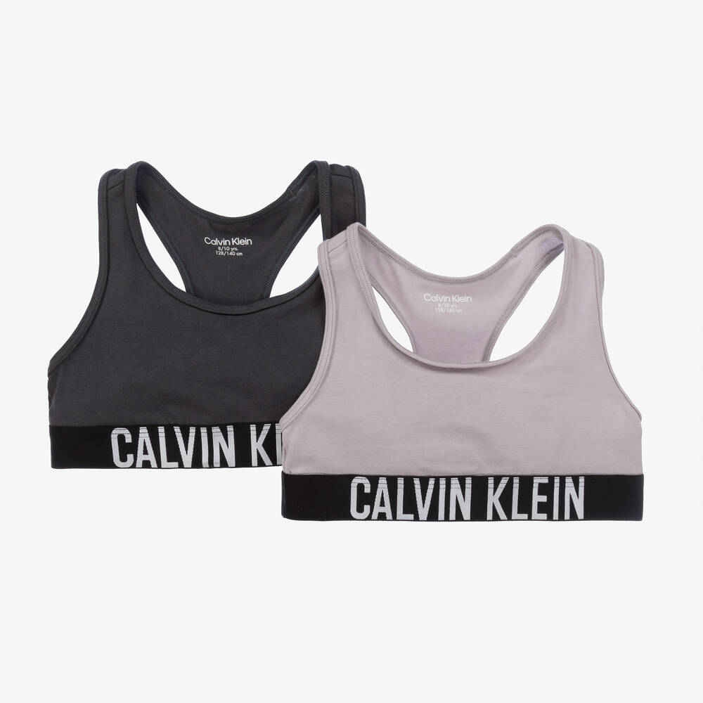 From Calvin Klein, a pack of two bralettes for girls in two tones of grey. Made in soft, stretchy cotton jersey, with racerback styling for a sporty finish they are finished with the iconic logo lettering on the trim.