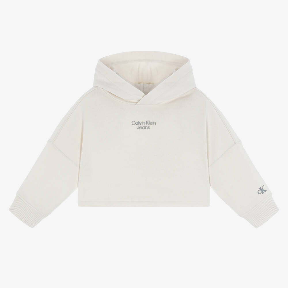 Ivory cropped hoodie for girls by Calvin Klein Jeans, with a grey logo printed on the front. It is made in stretchy jersey with a warm, fleecy inside and cosy, ribbed trims for all-day comfort.