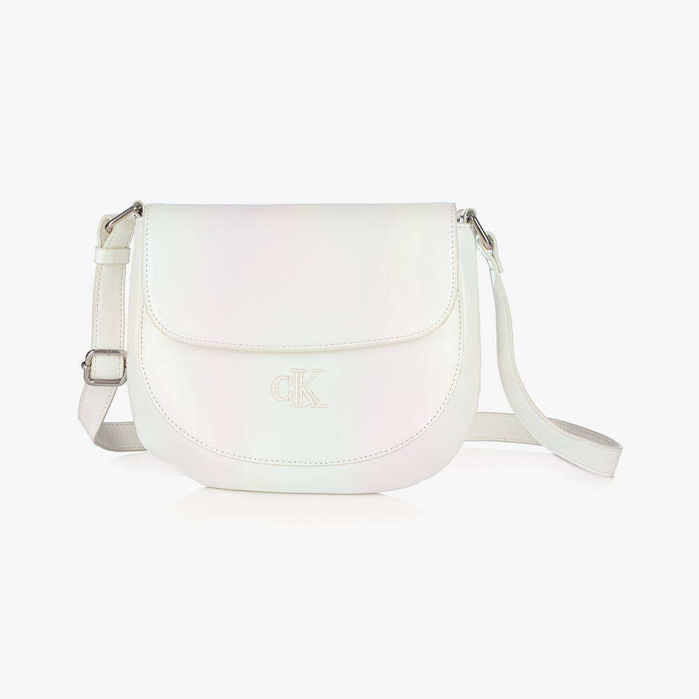Stylish ivory saddle bag for girls by American brand Calvin Klein, with a subtle iridescent pearl finish. It is made in super soft faux leather with the monogram logo embroidered on the front. A magnetic popper fastening front flap secures the compartment and it has a fixed strap which can be adjusted to be worn crossbody or shortened as a shoulder bag.