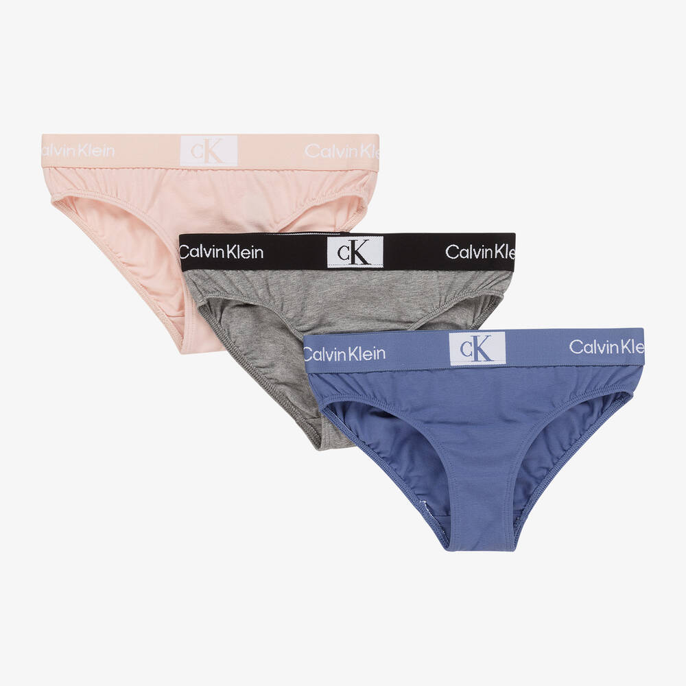 Three pairs of knickers for older girls by Calvin Klein, made in soft and stretchy cotton jersey for comfortable wear. In pink, blue and grey colourways, they have branded, elasticated waistbands featuring the Calvin Klein monogram logo for a distinctive look.