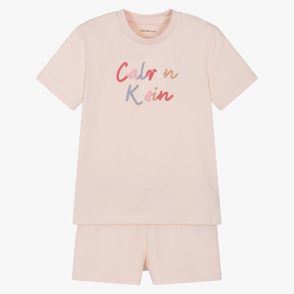 Pale pink shorts set for younger girls by Calvin Klein, made in soft and stretchy cotton jersey. The short-sleeved tee has a multicoloured logo design on the front for a branded look. Smaller sizes have shoulder poppers. The lightweight shorts have an easy drawstring waist to adjust the fit.