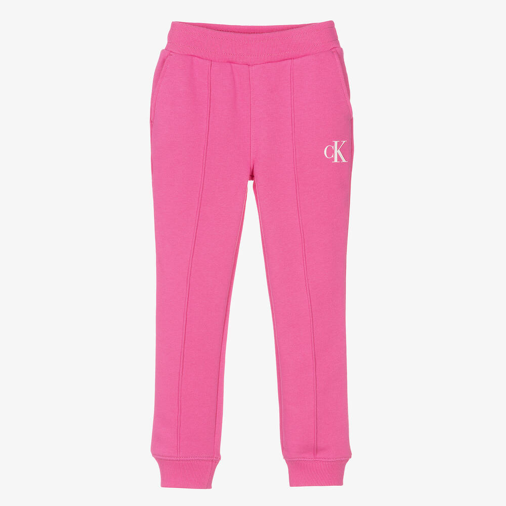 Casual bright pink joggers for girls by Calvin Klein, made from soft and comfortable cotton jersey. A signature white rubberised monogram logo is detailed on the front for a cool, branded look. They have an elasticated waistband, pockets and front seam detailing.