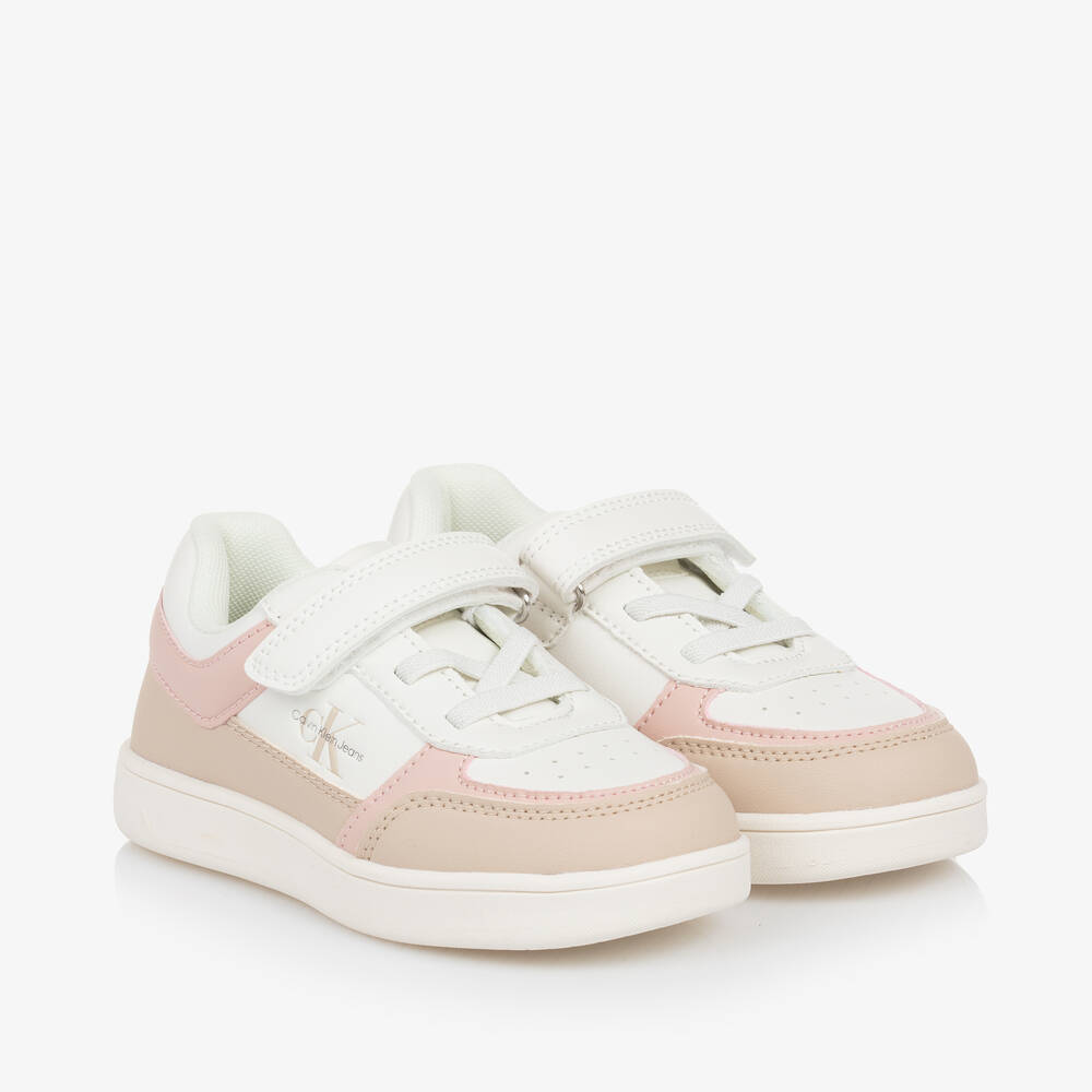 White faux leather trainers for girls by Calvin Klein, with pink and beige trims. The soft uppers have perforations on the front, faux laces and a velcro fastening strap across the foot. Lined in breathable mesh, they have removable insoles and non-slip rubber outer soles. They are finished with CK monogram logos on the tongue, the back of the heel and on one side. This product contains at least 50% recycled fabric.