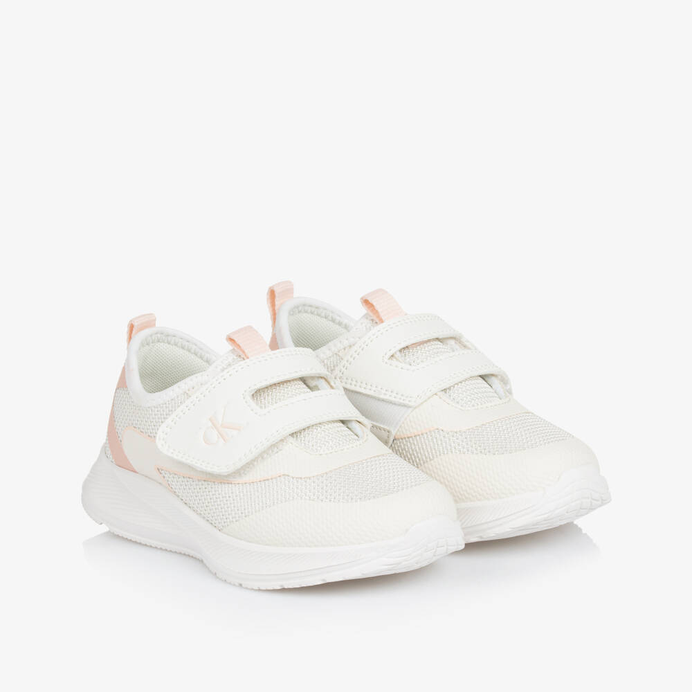 Sporty off-white trainers for girls by Calvin Klein, made in soft, glittery mesh with pale pink trims. Comfortable to wear, they have a lightly cushioned textile lining and insole, with a non-slip rubber outer sole providing good grip. The velcro strap features an embossed monogram logo for a subtle designer touch.