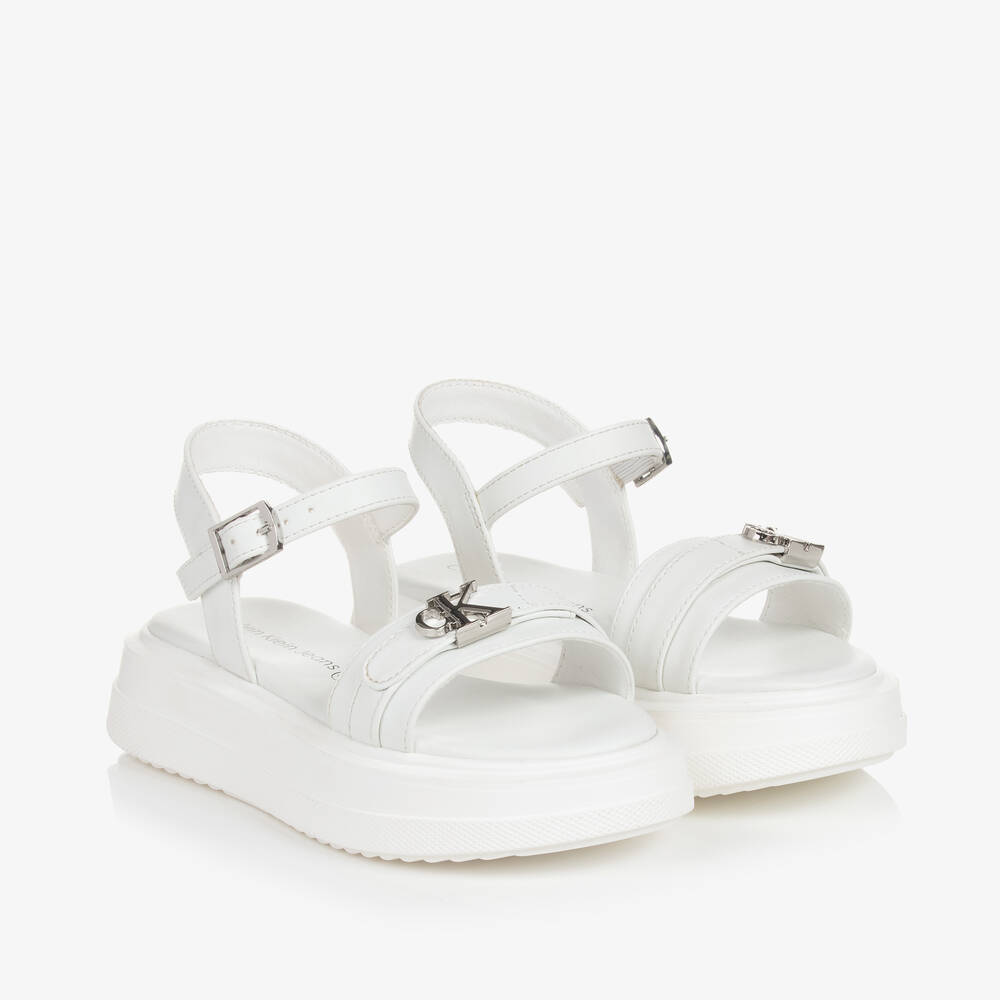 White platform sandals for girls by Calvin Klein, with a chunky rubber outsole for an edgy look. Made from smooth faux leather with a padded insole, there are silver-tone Calvin Klein monogram embellishments on the toes. Super cool and comfortable to wear, they fasten with silver buckles on the ankle.