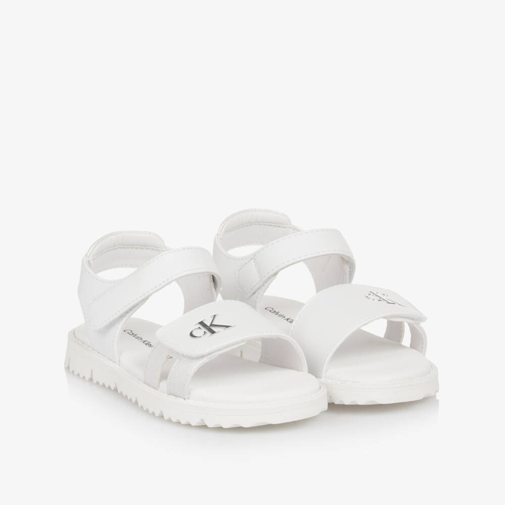 A lovely pair of white sandals for little girls from Calvin Klein. Made in durable faux leather with a textured rubber outer sole for improved grip, these strappy sandals fasten with velcro straps across the foot for a comfortable yet secure fit. Minimal use of silver glitter detailing and a metallic Calvin Klein monogram logo on the front gives a refined designer finish.