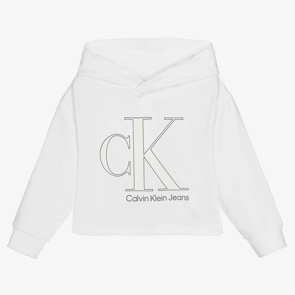 White hoodie for girls by Calvin Klein Jeans, made in comfortable cotton jersey with a stylish cropped fit. It has a white and black CK monogram logo printed on the front, with a fun sun reveal feature that causes the white print to change to a pretty blue and white floral pattern when exposed to sunshine.