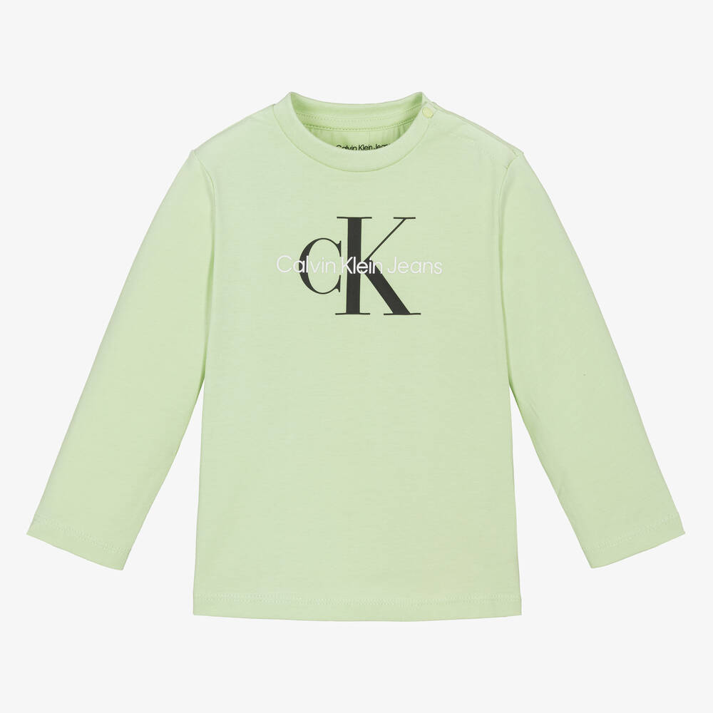 Mint green long-sleeved top for little boys and girls by by Calvin Klein, made in soft and comfortable cotton jersey. It has a CK monogram print on the front for a signature look.