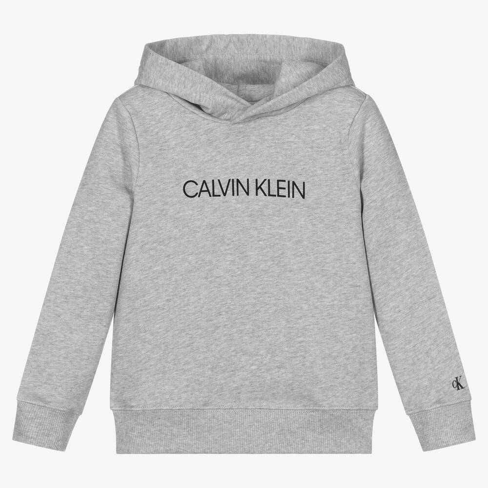 Grey cotton hoodie for boys and girls by Calvin Klein Jeans. Made with soft and stretchy sweatshirt jersey, the designer's logo can be found on the front in black, with monogram branding on one sleeve and a box logo on the back.