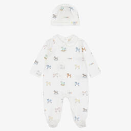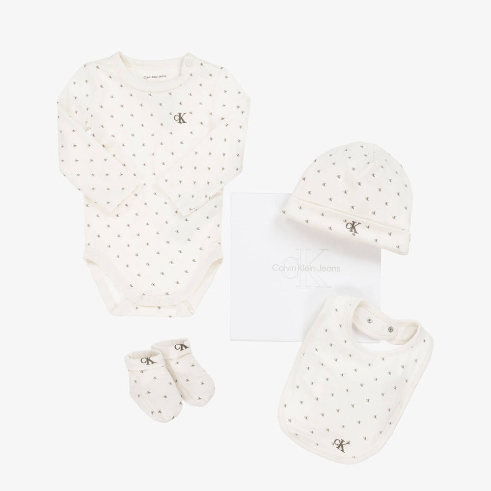 Ivory babysuit gift set for boys and girls by Calvin Klein, made in soft and gentle cotton jersey. The bodyvest has long-sleeves and hidden popper fastenings for easy dressing. The matching accessories have rubberised logos on the front for a complete look. All pieces in this set are patterned with Calvin Klein monograms.