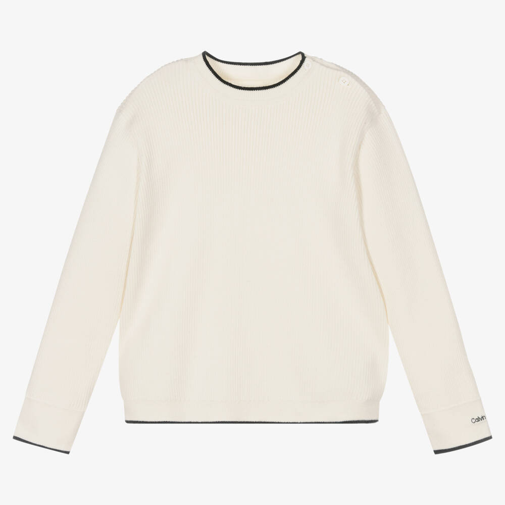 Sweet ivory sweater for boys and girls by designer Calvin Klein Jeans, knitted in a soft and comfortable ribbed cotton blend. It has black trims, delicate branded embroidery on one sleeve and button fastenings on one shoulder. This item contains at least 50% transitional organic cotton.