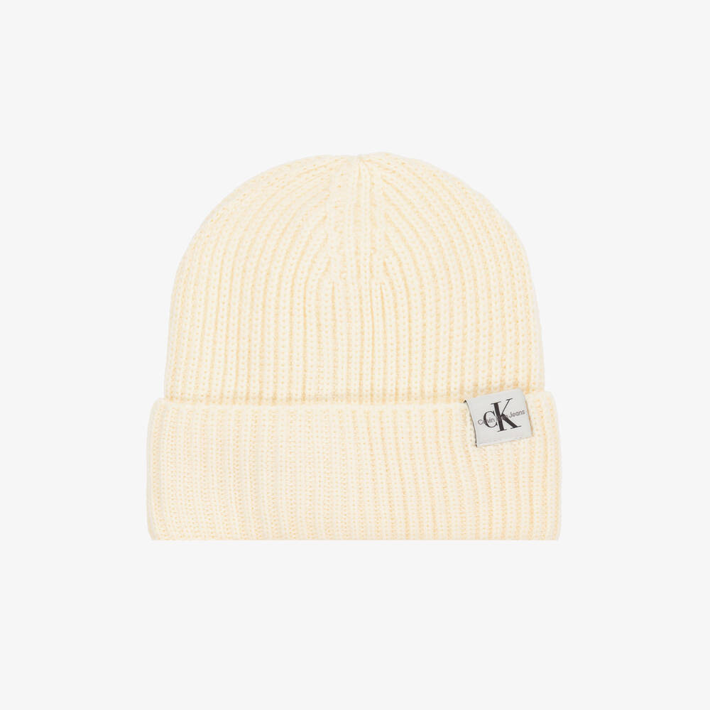 Ivory ribbed knit beanie hat for boys and girls by American brand Calvin Klein. This soft and stylish hat has a Calvin Klein Jeans logo patch on the turn-up brim for a branded look.