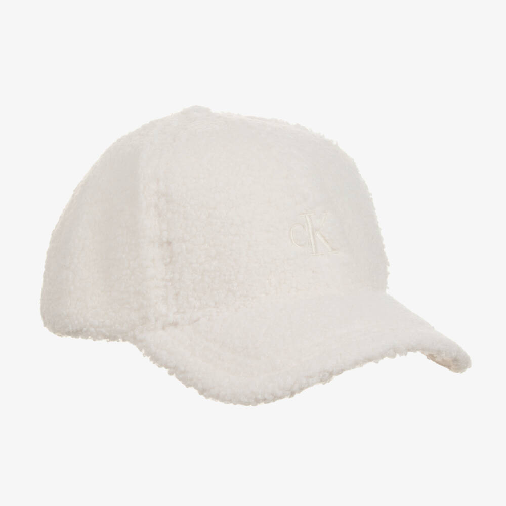 An ivory cap for boys and girls by Calvin Klein, in super soft teddy fleece. Cool for streetwear looks, it has a tonal monogram logo embroidered on the front. An adjustable velcro strap fastens on the back.