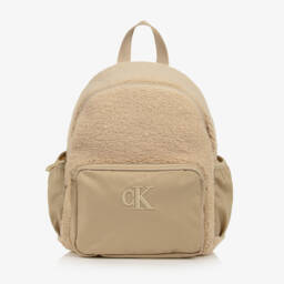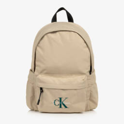 Pale pink canvas backpack for boys and girls by Calvin Klein, ideal for back to school. It is printed all over with the brand's signature logo and has a CK patch on the front zipped pocket. The main compartment fastens with a chunky zip and includes a padded section for a laptop or tablet. There are side slip pockets and the adjustable shoulder straps are padded for comfort.