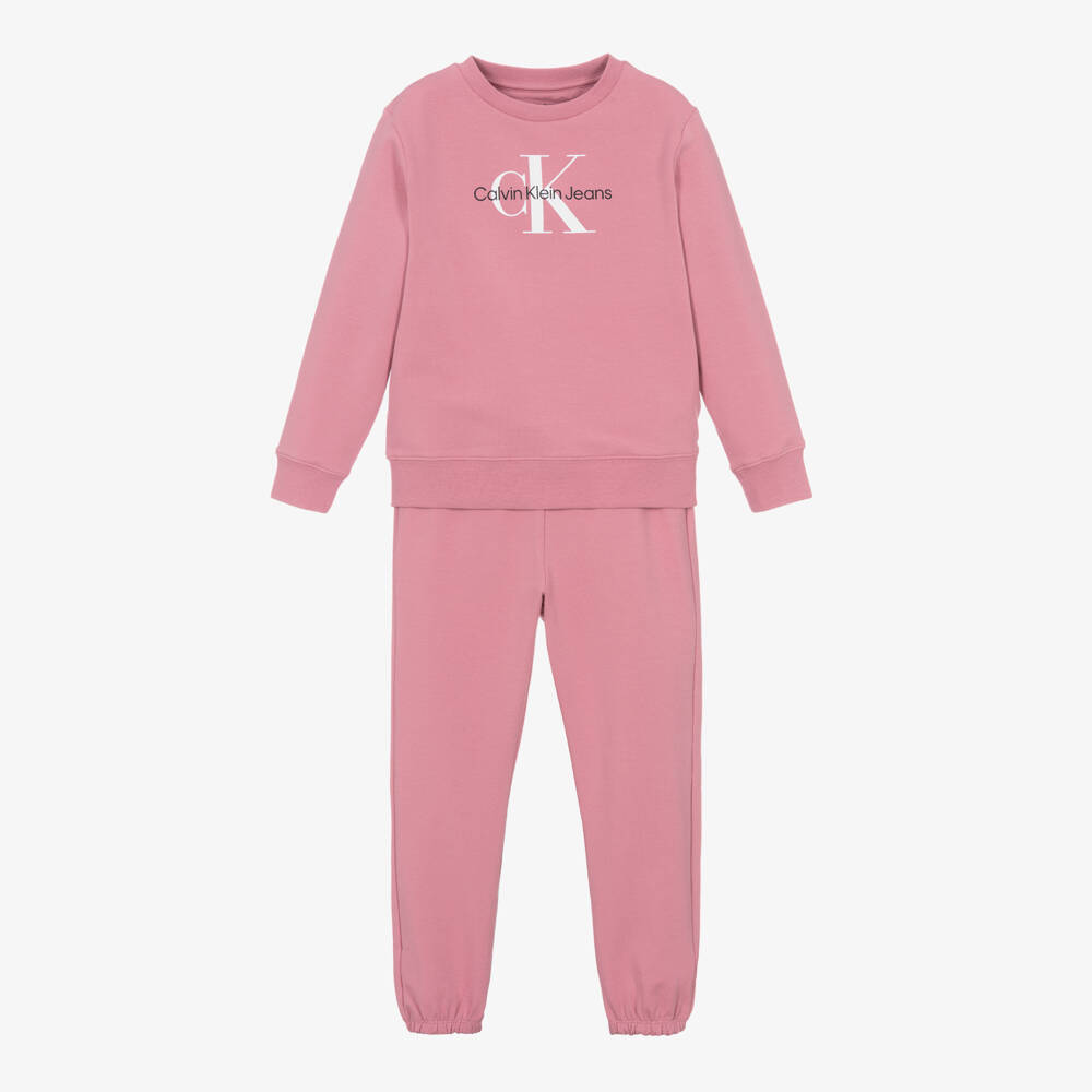 Casual pink cotton tracksuit for little boys and girls by American brand Calvin Klein. Just right for relaxed days, it is made in comfortable, stretchy jersey, with cosy ribbed trims on the sweatshirt and elasticated cuffs on the joggers. The designer's monogram logo is printed on the top in white and black, and in white by the drawstring waistband of the joggers. The tracksuit is made with at least 50% organic cotton.