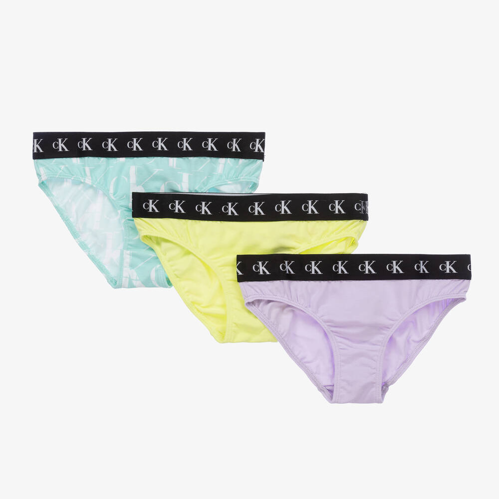 Three pairs of knickers for older girls by Calvin Klein, in shades of lilac purple, lime green and mint green. In a useful multipack, these cotton jersey knickers have signature logo tape waistbands for extra comfort. One pair is patterned with a white Calvin Klein monogram design.