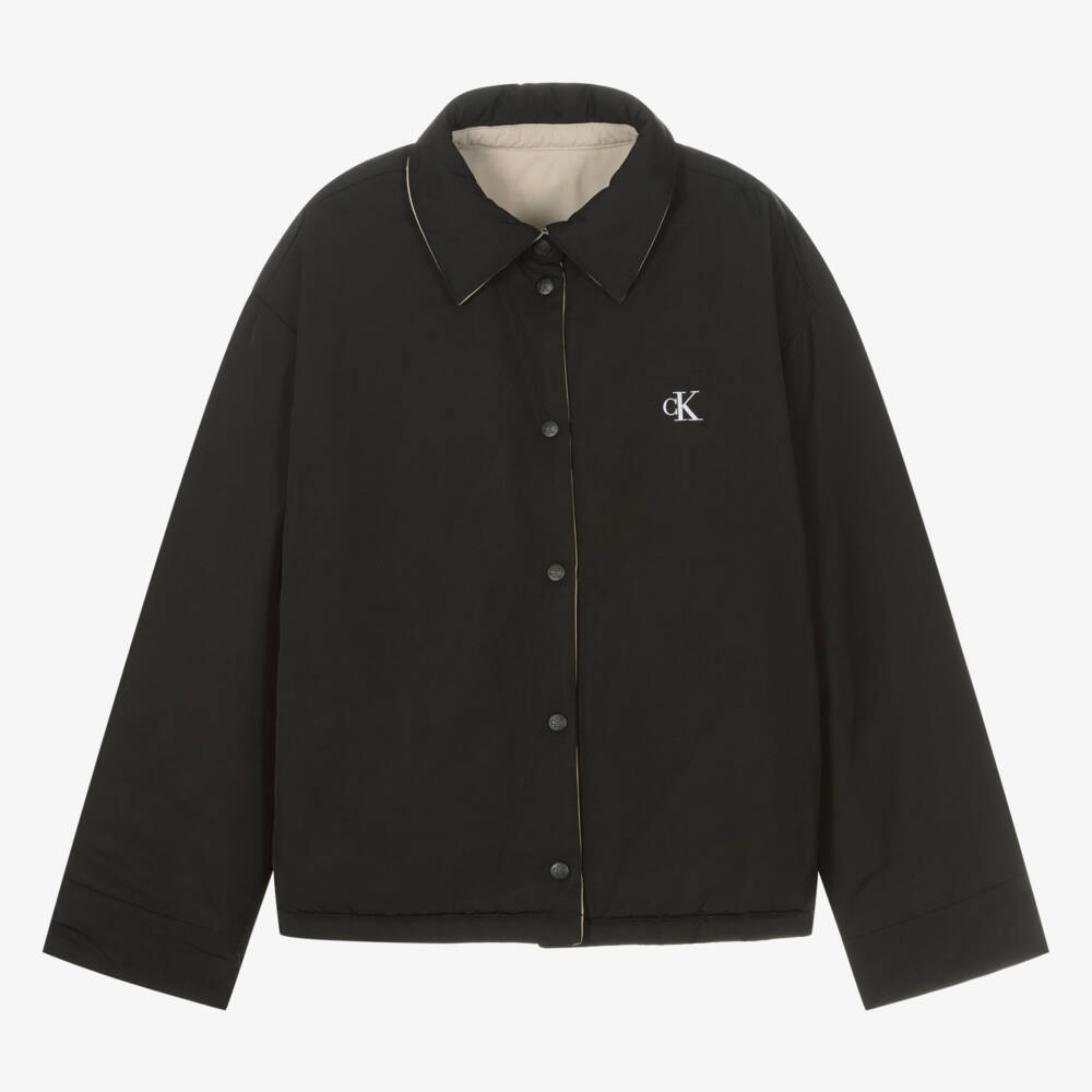 Stylish and reversible, this smooth, twill jacket for teen boys and girls is by American designer Calvin Klein. Boxy and lightly padded for warmth, the black side has useful, concealed side pockets, an embroidered grey monogram logo on the chest and a large grey and white monogram logo printed on the back. The beige side has front pockets, with a black monogram logo badge on the front. Both sides fasten with logo poppers. The outer material contains at least 95% recycled material, whilst the padding is made with at least 50% recycled polyester.