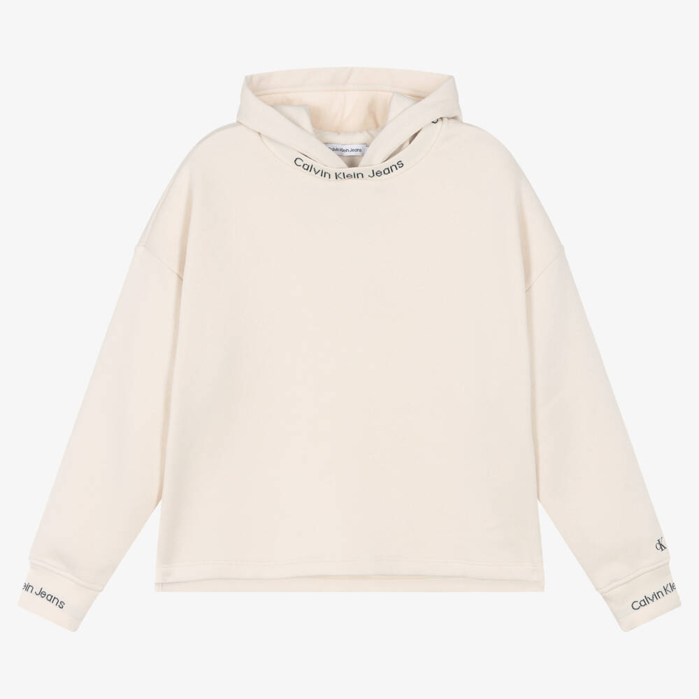 Casual beige jersey hoodie for teen boys by Calvin Klein. It has branded ribbed trims and the iconic CK monogram on one sleeve. This relaxed fit hoodie is made in a mid-weight cotton blend with a cosy fleece inside.