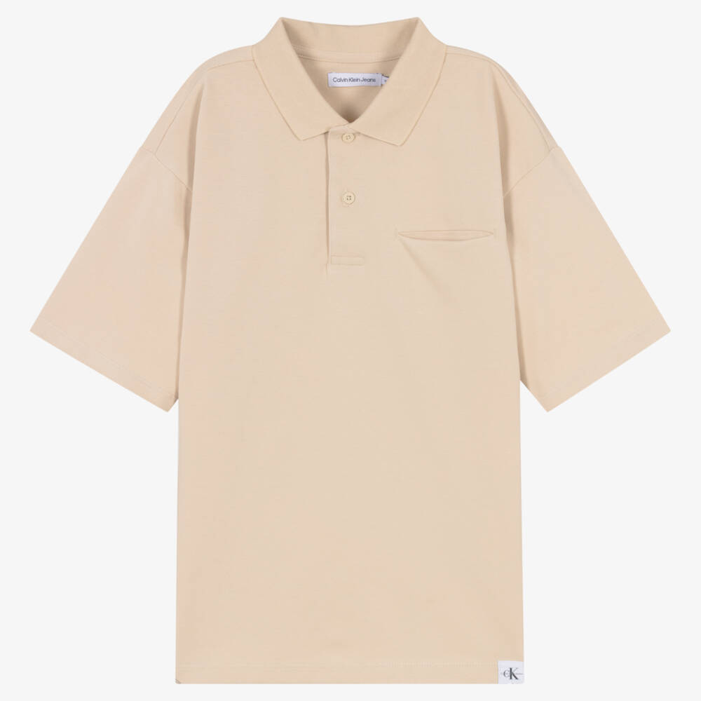 Beige polo shirt for teen boys by American brand Calvin Klein Jeans, with the designer's monogram logo tab on the hemline. Stylish and with clean lines, it has a ribbed collar, a two-button placket and a neat pocket on the chest. The top is made in comfortable cotton piqué with side vents, giving extra room for when worn on those relaxed, casual days.