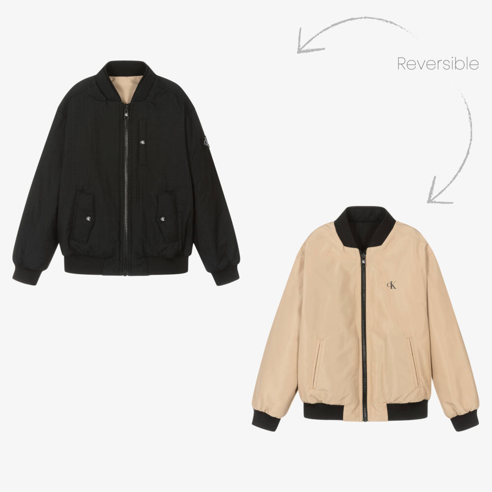 A cool black and beige reversible bomber jacket for teen boys by Calvin Klein. In lightweight ripstop, the black side is designed with contrast white branding on the popper fastening pockets and embroidered patch on one sleeve. The beige side is woven in silky soft fabric, with striking black ribbed trims, handy front pockets, and a Calvin Klein monogram graphic on the chest. The label's branding can be found on the zip for a designer finishing touch. This product is made with at least 50% recycled materials.