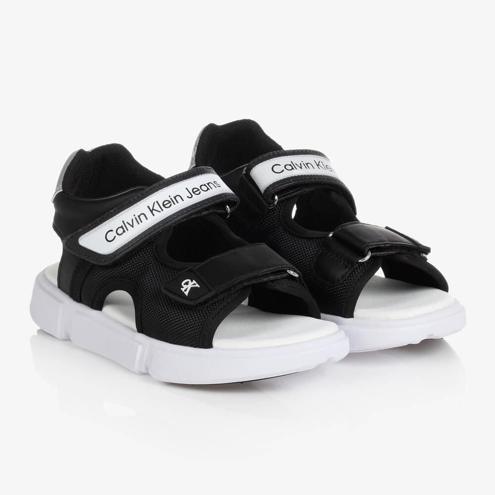 Teen boys black sandals by Calvin Klein jeans. Made from soft textiles with logo-branded velcro strap fastenings. They have a soft textile inner sole and a moulded, non-slip outer sole. Made with at least 50% recycled materials.