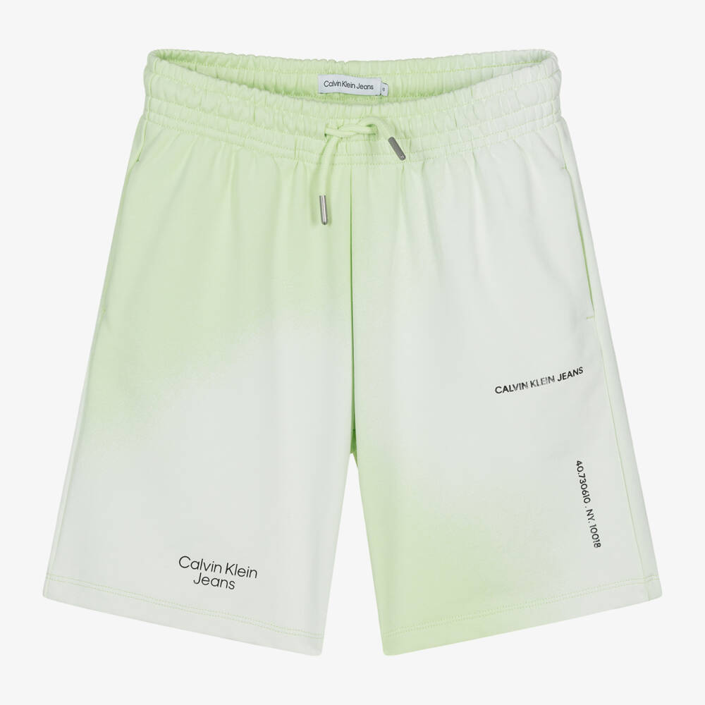 Casual lime green shorts for teen boys by Calvin Klein, patterned with a white spray paint effect to channel an urban, edgy look. They are printed with a bold, black coordinate logo design on the front for a branded vibe. The comfortable, cotton jersey material, stretchy drawstring waist and concealed seam pockets make these shorts ideal for laid-back days.