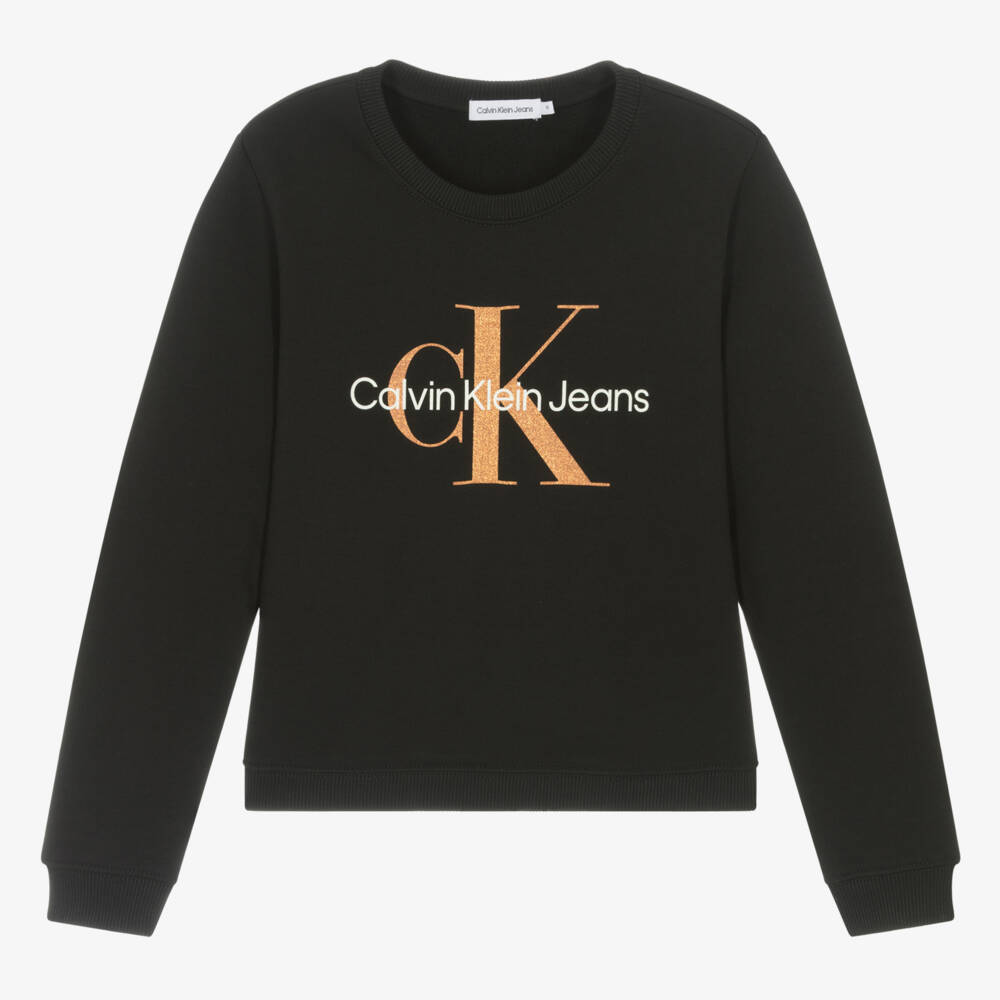 Stylish for everyday casual, this black sweatshirt for teen girls is by American brand Calvin Klein. Instantly recognisable, it has a glittery bronze and white CK monogram logo on the front. This relaxed fit design is made from soft, mid-weight cotton jersey with comfortable ribbed trims.