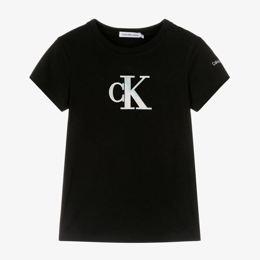 Calvin Klein's black slim fit T-shirt for teen girls is made from comfortable cotton jersey. It features an iridescent monogram logo on the front and a white logo print on one sleeve for instant designer appeal.