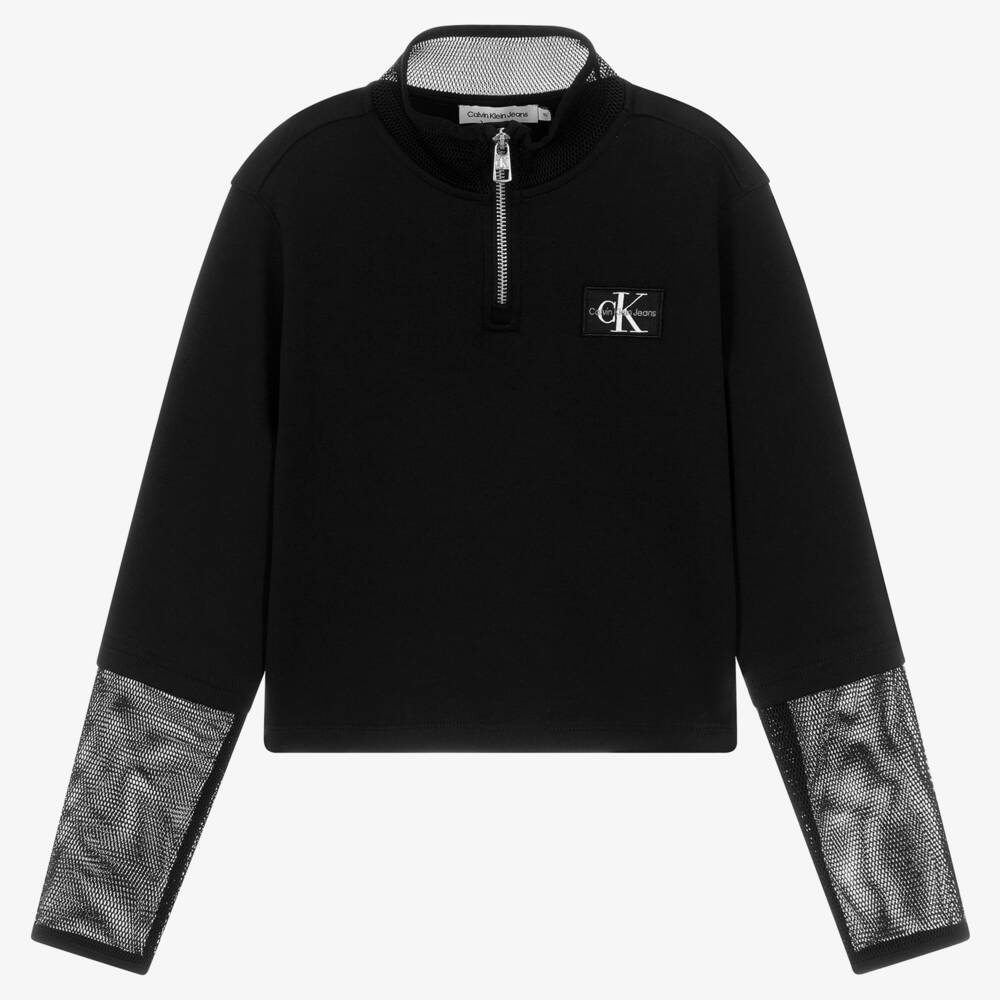 Black sweatshirt for teen girls by Calvin Klein Jeans, with an embroidered monogram logo patch on the chest. Made in stretchy cotton-blend jersey, this athletic-style top has a funnel collar with a branded half-zip opening. Mesh trims on the arms and collar add a sporty element.