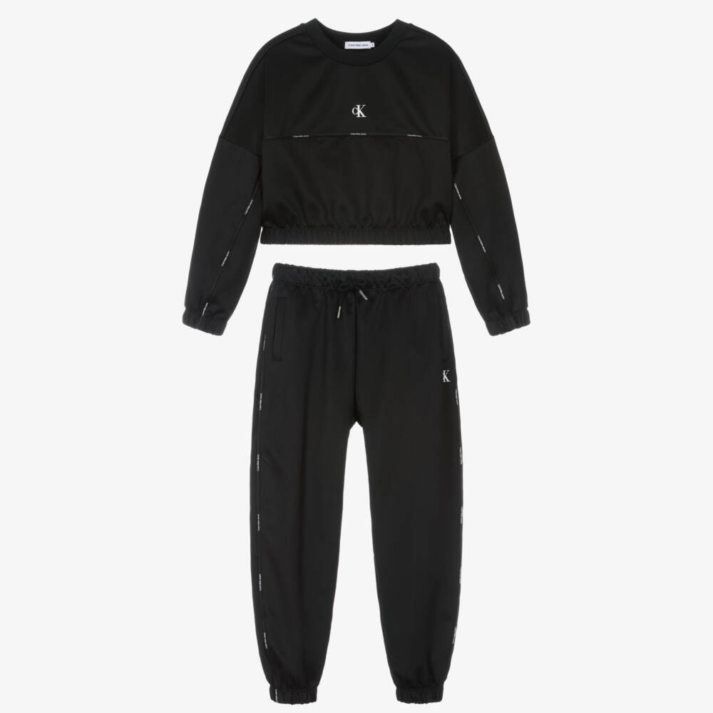 Black tracksuit for teen girls by Calvin Klein Jeans, featuring the iconic white CK monogram logo print on the front. This stylish tracksuit is made in a silky smooth jersey with logo tape trim adding extra designer appeal. The top boasts batwing sleeves and a cropped length for a stylish look, while the joggers have a drawstring waist and useful front pockets. This tracksuit is made with at least 50% recycled polyester.