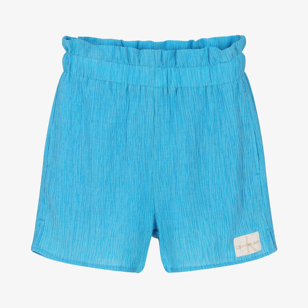 Blue shorts for teen girls by Calvin Klein Jeans. A unique textured finish, the crinkle-effect outer fabric and voile lining are super soft and lightweight, great for casual wear in warmer weather. These cool shorts have a flattering elasticated paperbag waist, an ivory monogram logo patch on the hem and handy side pockets. The side hems are vented for freer movement. Eco-conscious, they are made with at least 50% Tencel Lyocell.