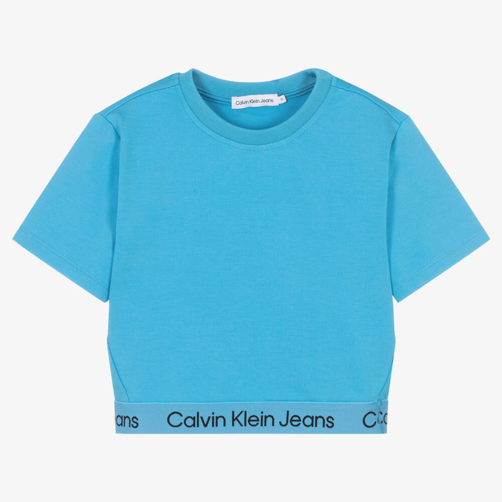 An unmistakable Calvin Klein Jeans piece, this blue cropped T-shirt is designed for teen girls. An iconic feature of the brand, it is trimmed with blue and black jacquard logo tape on the hem. It is made in soft, stretchy and comfortable jersey.