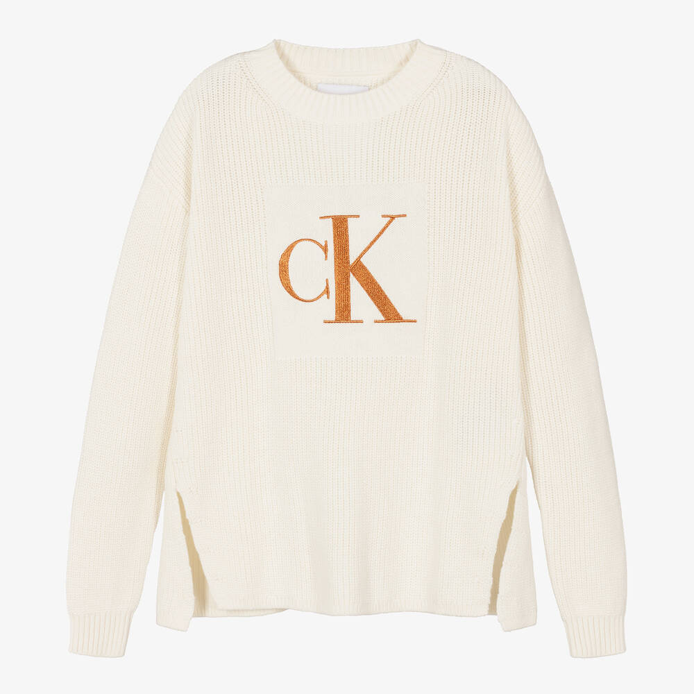 This ivory sweater for teen girls from Calvin Klein, features the iconic Calvin Klein monogram embroidered on the front in sparkling bronze. Comfortable to wear, It is knitted in soft organic cotton and has a stylish split hem.
