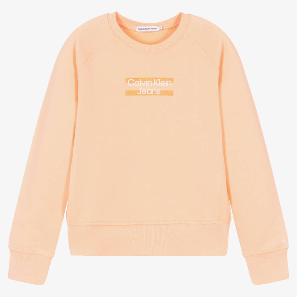 Pastel orange cotton shorter-length sweatshirt for teen girls by Calvin Klein Jeans. In an on-trend boxy fit, it has a white flocked logo with orange block stripes across the front. The label's white monogram logo print can be found on one raglan sleeve.