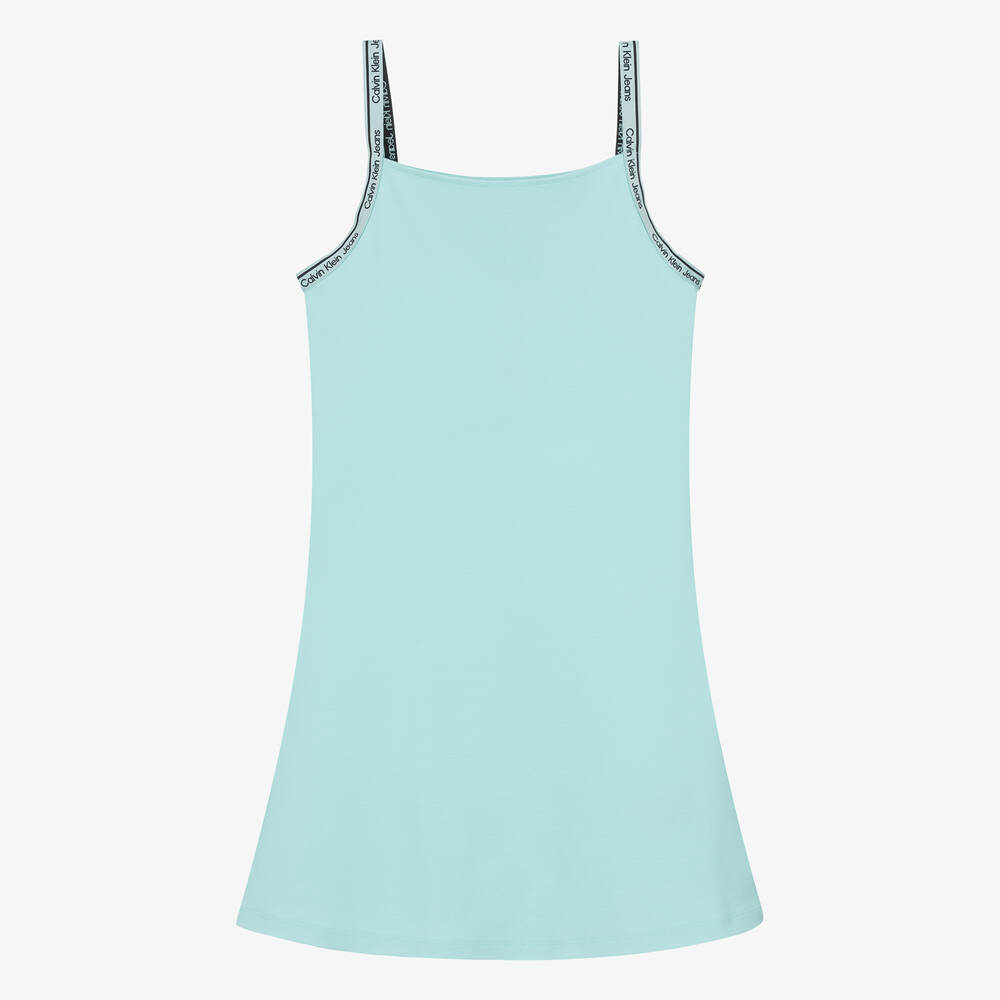 In a light shade of turquoise blue, this Milano jersey dress for teen girls is from Calvin Klein. Soft and stretchy, it is styled with a square neckline and a slight A-line silhouette. The narrow tape shoulder straps are comfortably elasticated and woven with the signature Calvin Klein Jeans logo. This item is made with at least 50% Lenzing Ecovero viscose fibers.