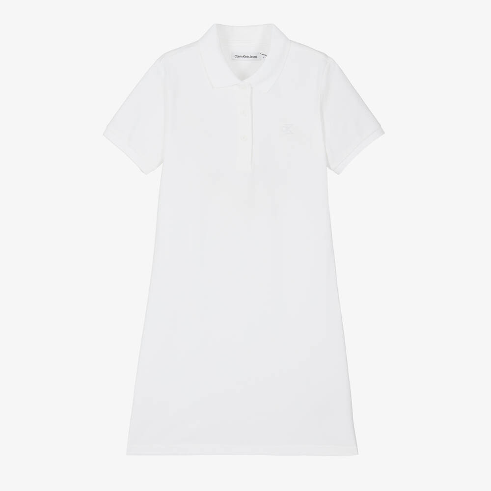 Casually sporty, this white polo dress for teen girls is from Calvin Klein Jeans. The signature Calvin Klein monogram is embroidered on the bodice, in a tonal shade for minimalistic recognition. There is a smart-casual collar, with logo-embossed button fastenings beneath. This cotton piqué dress is easy-to-wear and style in a pretty A-line design.