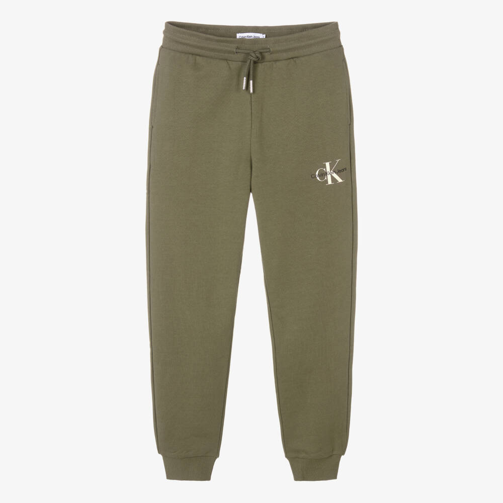 Olive green joggers for teen boys and girls by American designer Calvin Klein, with the brand's distinctive CK monogram logo print on the front. This comfortable cuffed style is made in soft, mid-weight cotton jersey, with side seam pockets and a drawstring waistband completing the casual look.