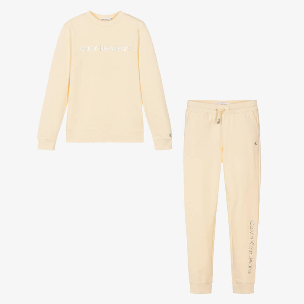 Ideal for relaxing in style, this dark ivory tracksuit for teen girls is from American brand, Calvin Klein. For instant designer appeal, both pieces are detailed with shiny silver logo prints. This comfortable set is made in mid-weight cotton jersey with soft ribbed trims. The joggers have an adjustable drawstring waist and three practical pockets.