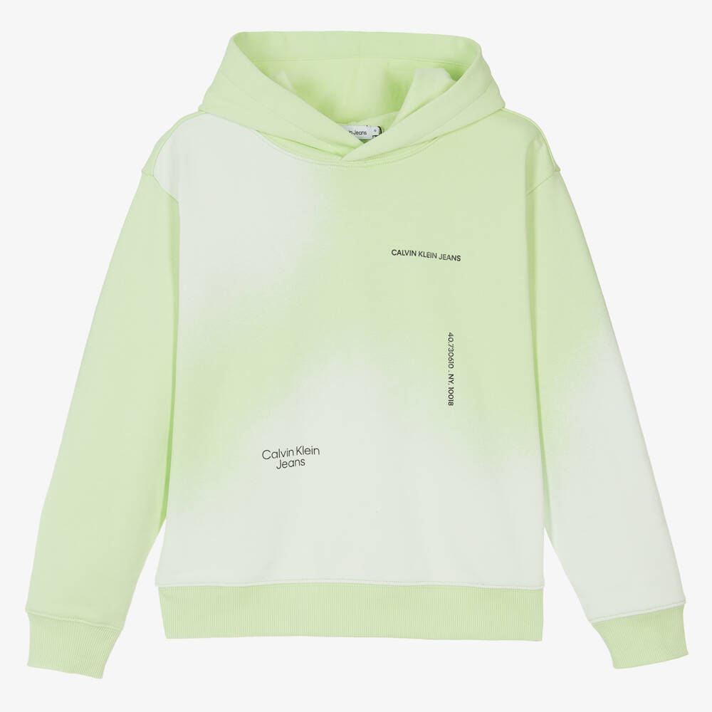 Casual lime green hoodie for teen boys and girls by Calvin Klein, patterned with a white spray paint effect to channel an urban, edgy look. Ideal for laid-back days, this relaxed, long-sleeved hoodie features Calvin Klein Jeans logo lettering on the front in black. The comfortable, cotton jersey material, along with a hooded neckline and stretchy ribbed trims make this a great layering option.