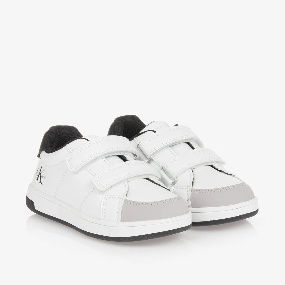 White with grey and black trims, these faux leather trainers for boys and girls are by Calvin Klein. Fastening easily with velcro straps, they are lined in soft textile and have non-slip rubber soles for good grip. The brand's signature CK monogram is visible on the side of the heel.